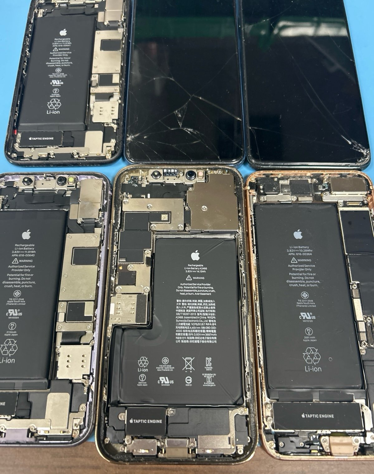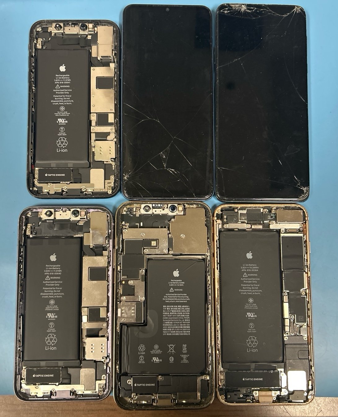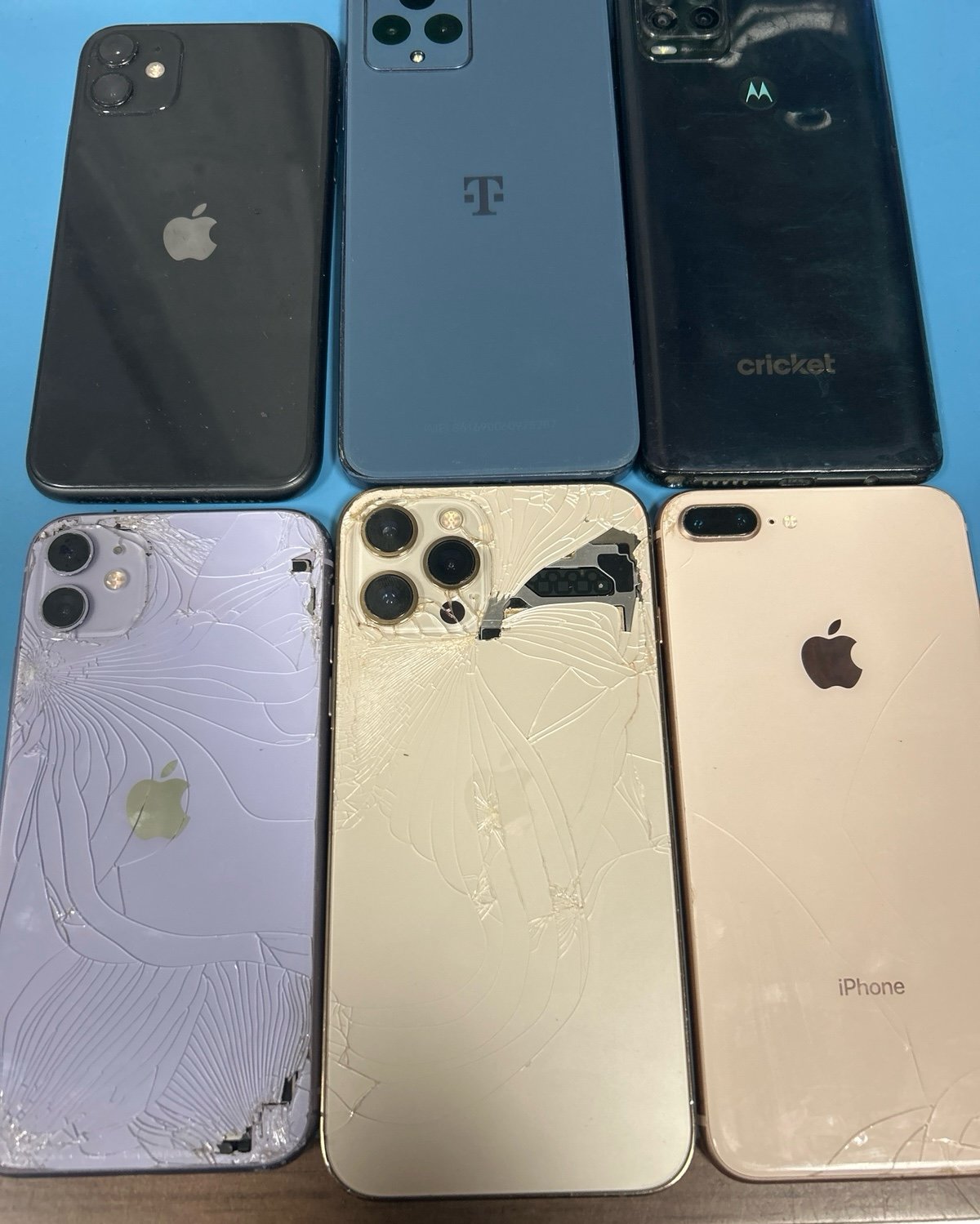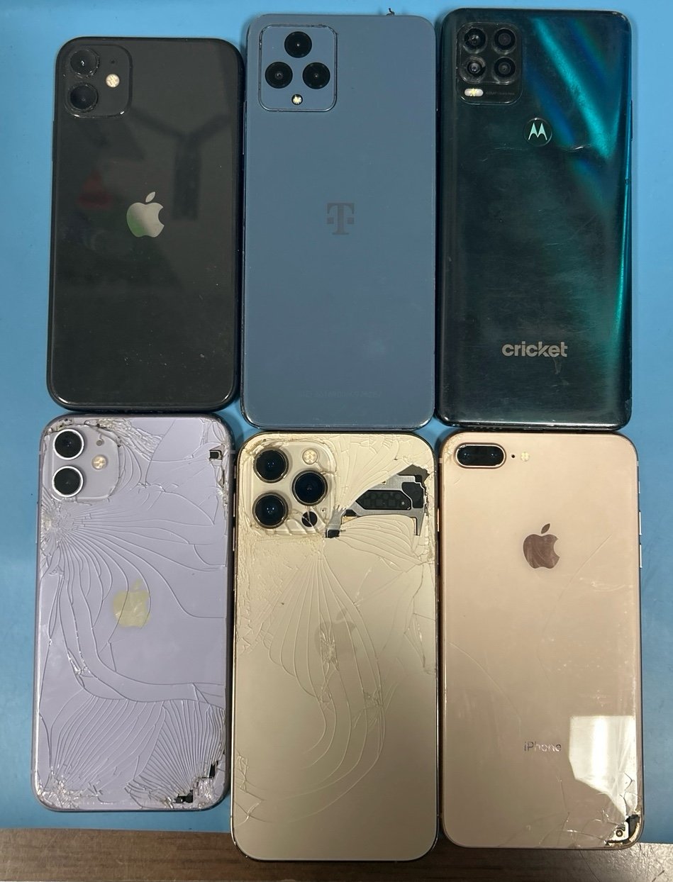- 2 iPhone 11s 1 iPhone 12 pro max 1 iPhone 8 plus 1 motorola (not sure of model) and 1 revvl 6.