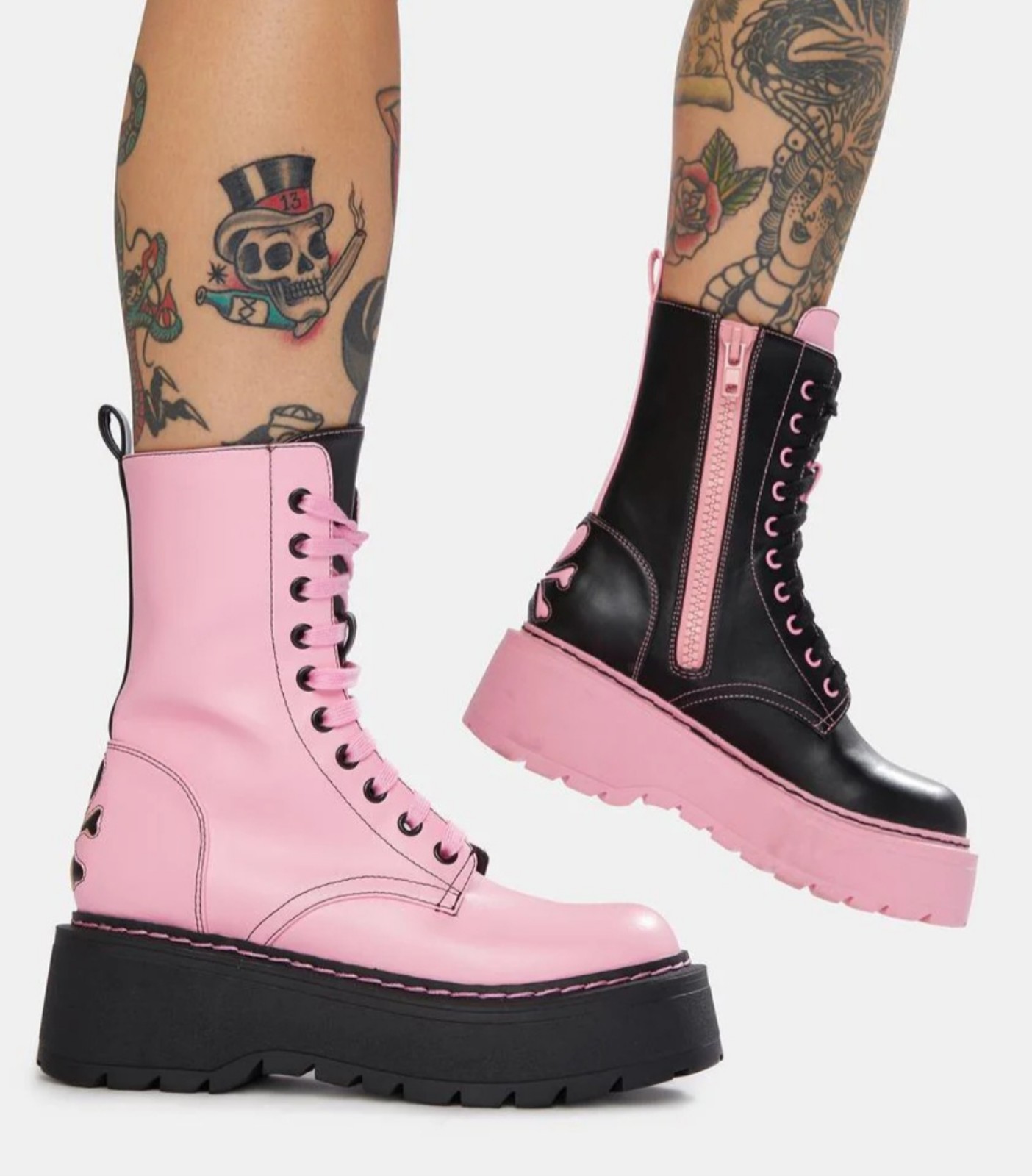 Super cute chunky pastel goth combat boots from Dolls kill. These were a special edition collaboration with Tokidoki, and I added cute plush hair ties of kuromi and my melody to the laces. They are sooooo cute and comfy. Only worn once, there are some small stuffs on the soul, no skuffs or marks on the actual shoe!!! I'm pretty sure a magic eraser could get it off. Size 10 and will fit a 10.5 as well.