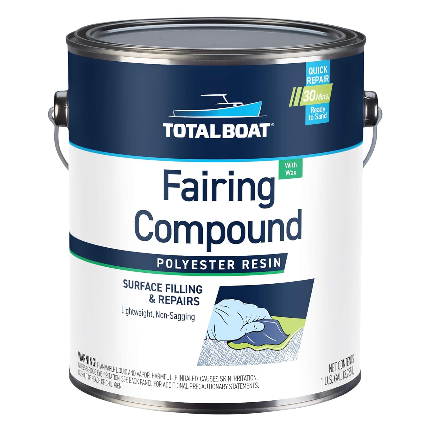 TotalBoat Polyester Fairing Compound drags smoothly, sets up fast, and sands like a dream for quick and easy cosmetic repairs on boat gelcoat, fiberglass, and other composite surfaces above the waterline. Premium thickened polyester resin fills, fairs, and feathers to perfection, so repairs blend easily into surrounding surfaces. This high-viscosity polyester marine filler is easy to mix with the included MEKP catalyst to achieve a smooth, creamy paste that spreads easily, feathers well, and sets up quickly, without sagging. In as little as 30 minutes, it cures to a hard material with optimal strength and easy sanding ability. It's easy to maintain a feathered edge while sanding thick or thin areas, so with very little effort (and very few sandpaper change-outs) you get a perfectly smooth, pinhole-free surface that's ready for paint or gelcoat. This lightweight cosmetic filler also has minimal shrinkage and less odor than traditional polyester fairing compounds. In addition, you can tint Polyester Fairing Compound with polyester resin-safe colorants for a closer match with existing gelcoat. Polyester Fairing Compound has many uses including composite tooling and repair applications, but is designed for use as a fairing material only. For high-strength repairs to fix deep gouges, cracks, dings, dents, and small holes, use TotalBoat Polyester Structural Repair Putty first, allow to cure, then apply TotalBoat Polyester Fairing Compound. If used below the waterline, Polyester Fairing Compound must be overcoated with an epoxy barrier coat primer. Compare to 3M Marine Premium Filler, FGCI Gelcoat Putty, Evercoat Polyester Glazing Putty, 3M Platinum Filler, 3M Platinum Plus Filler and 3M Platinum Select Filler. All TotalBoat products provide great value and great results. 100% made in the USA.